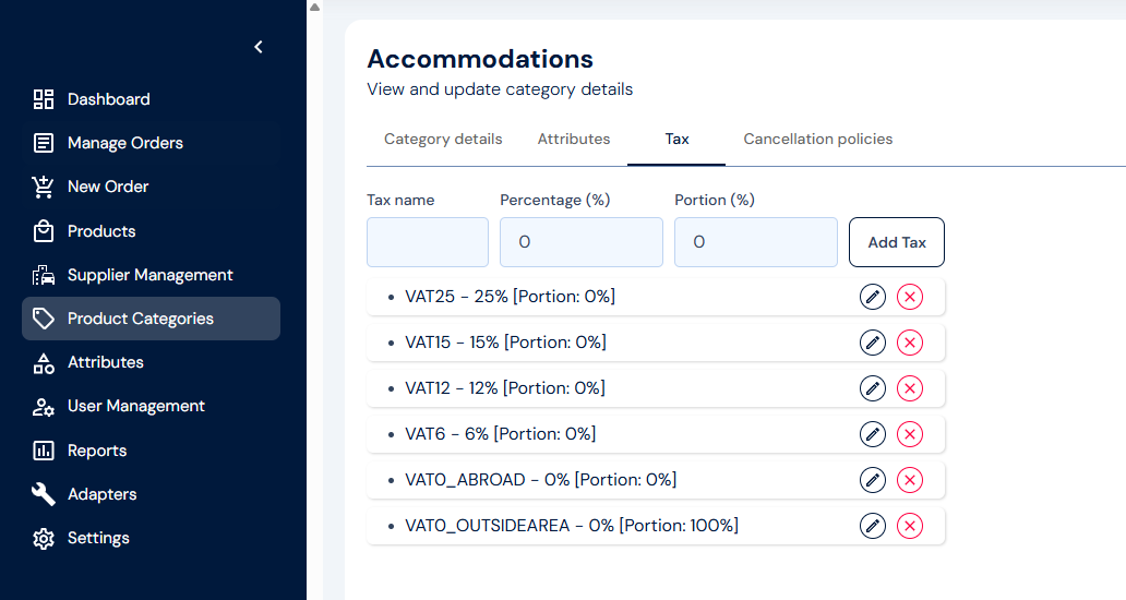 The Management App is your operational control center. Use it to manage product categories, configure tax rules and cancellation policies, create or edit orders, manage users, and run financial reports. No technical team required.