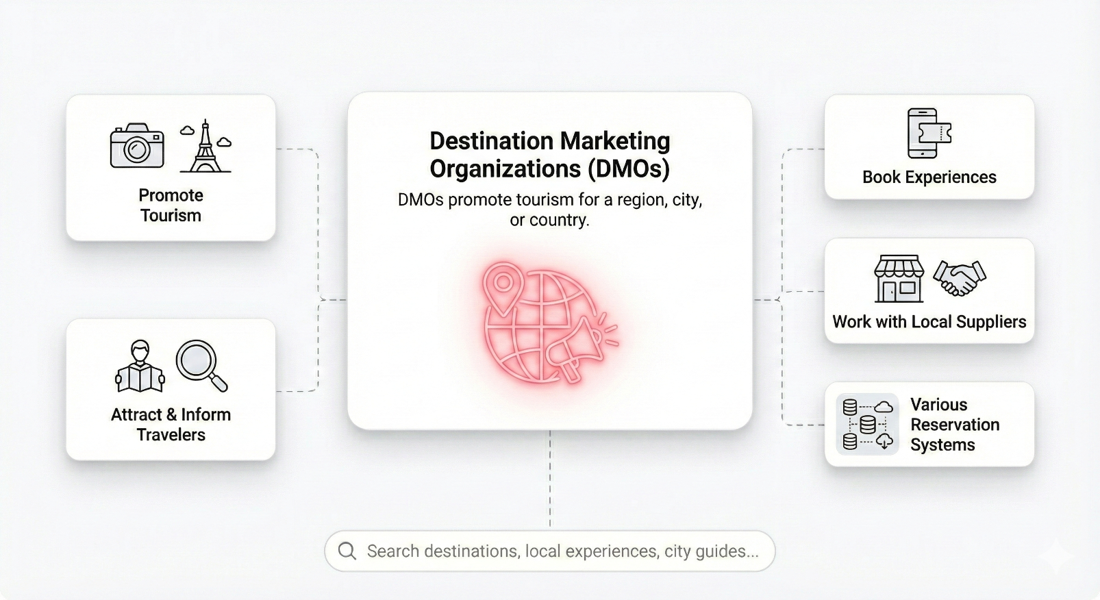 DMOs promote tourism for a region, city, or country. Their job is to attract and inform travelers—and increasingly, to help travelers book the experiences they discover. DMOs typically work with a large number of small, local suppliers using a variety of reservation systems (if any at all).