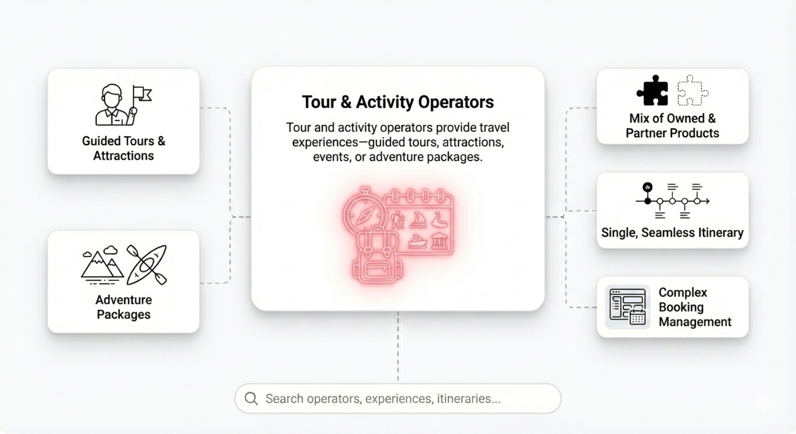 Tour and activity operators provide travel experiences—guided tours, attractions, events, or adventure packages. Many work with a mix of owned and partner products, and often struggle to combine them into a single, seamless itinerary.